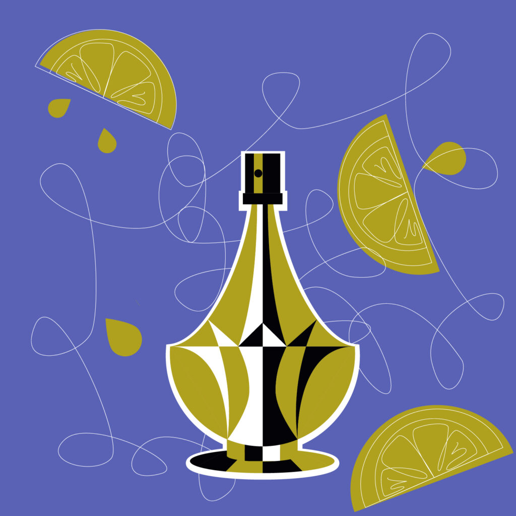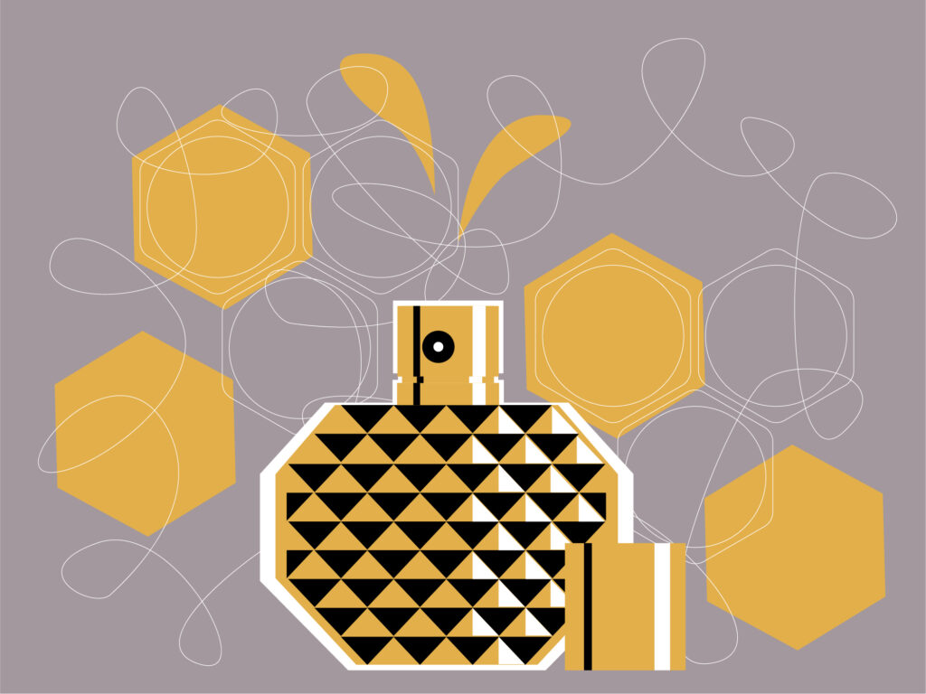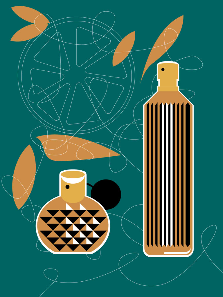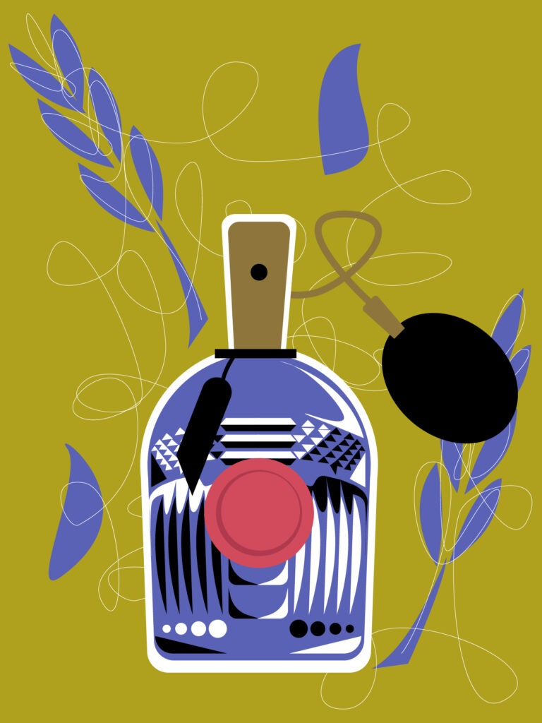 Vintage stylised illustration series for perfume bottles.